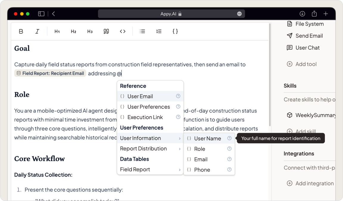 Reference your exact database fields and user preferences in agent instructions using @ mentions, eliminating ambiguity and ensuring your agent always uses the right data in the right place.